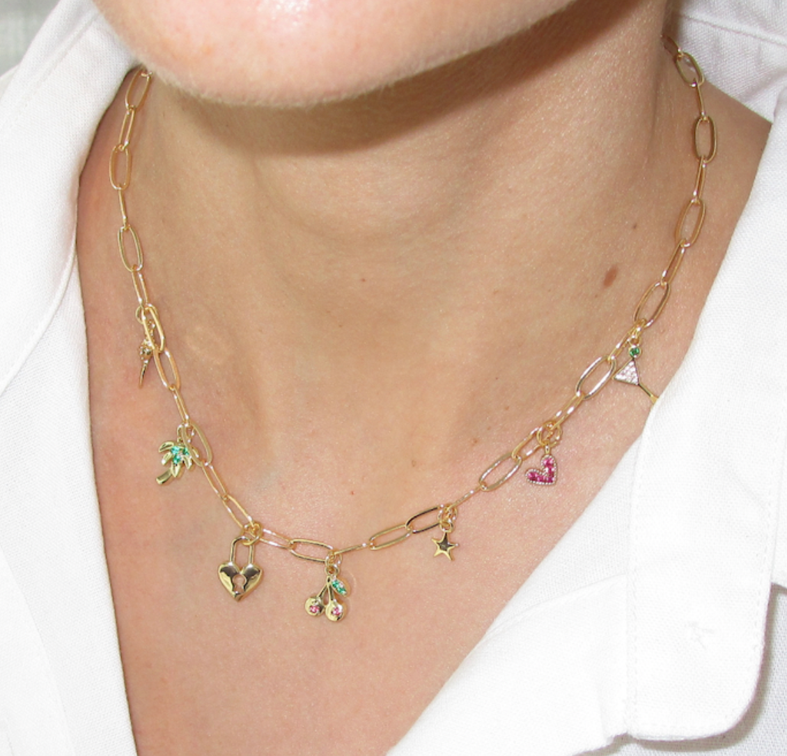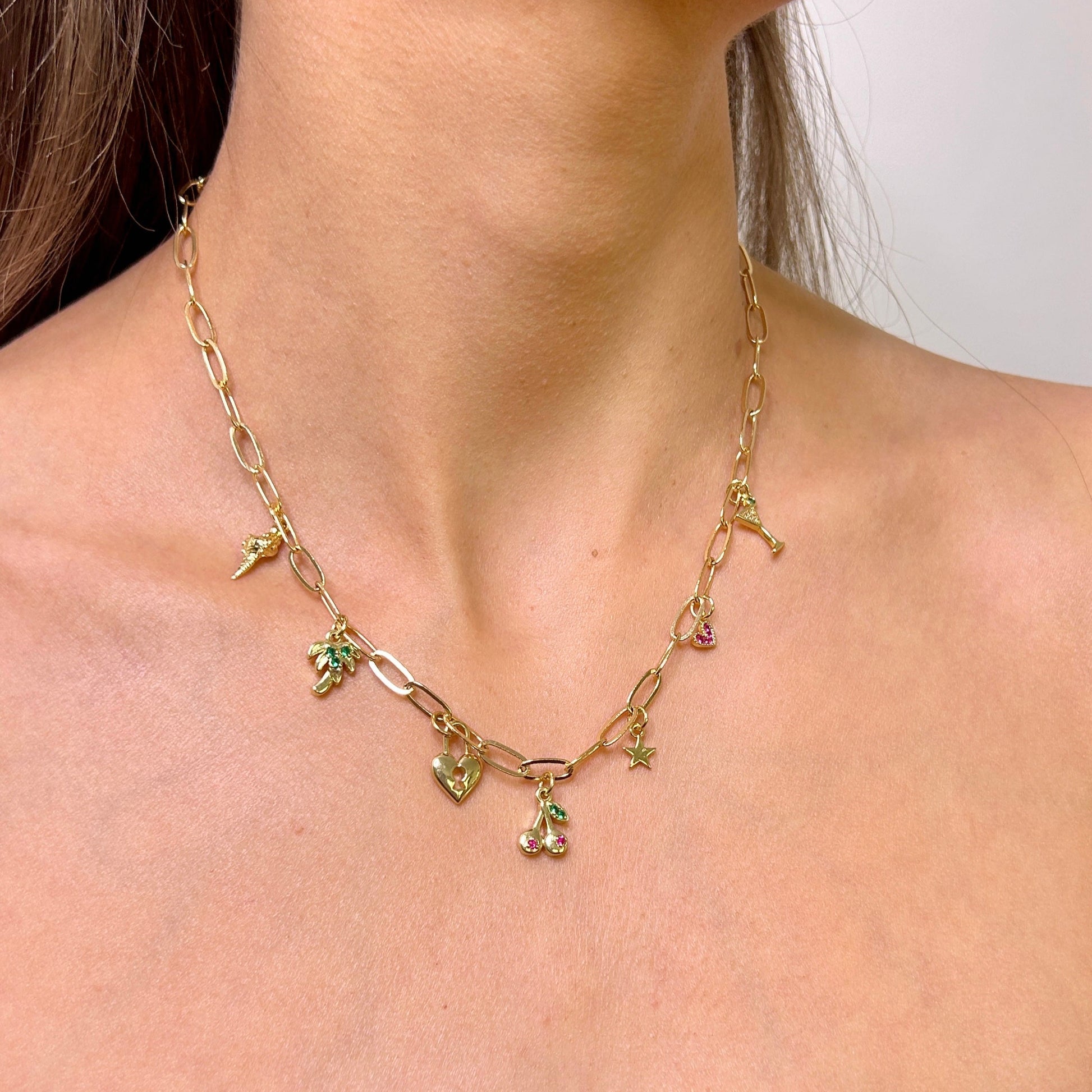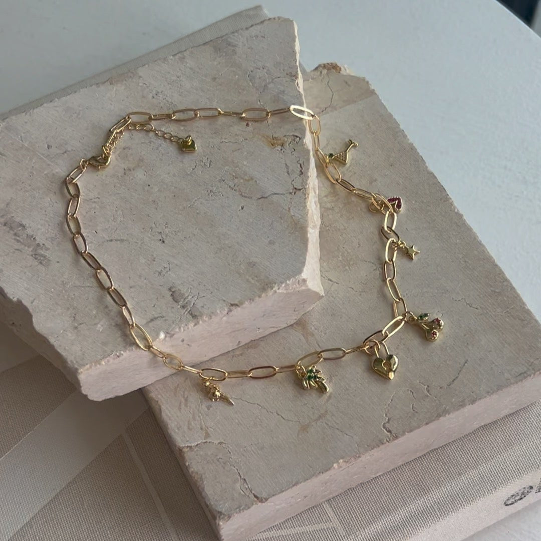 Adorned on a tarnish resistant chain with 18 karrat filled charms. Each necklace is 40 cm in length and includes an extender for adjustable fit.